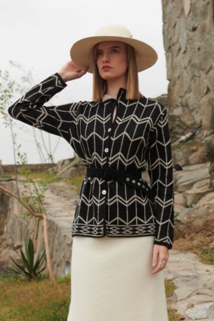 Cardigan reversible con cuello versátil, inspirado en figuras geométricas. Tejido de punto, industrial. Elegante, abrigadora y confortable.