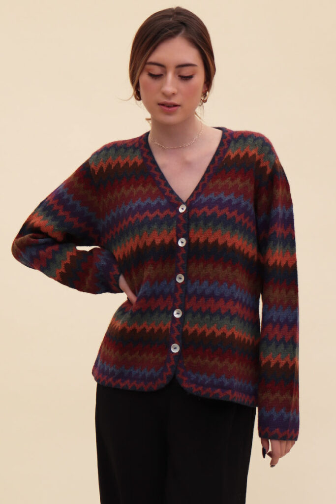 Cardigan casual y versátil, con cuello en punta y botones en concha de Nácar. Diseño inspirado en los colores andinos en forma geométrica zigzag.